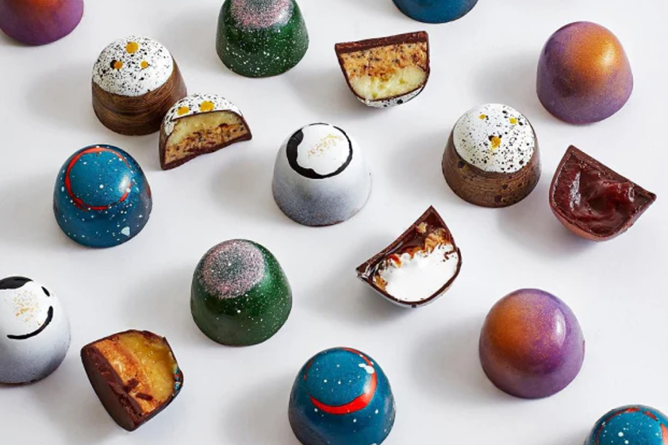 Each piece is made of a thin shell of either white, milk, or dark chocolate that gives way to a melt-in-your-mouth filling. We work with real butter, nuts and fruit purees, and the highest quality chocolate. Each of our bonbons a perfect bite of vivid flavour, taking you on a journey from surprise to delight.